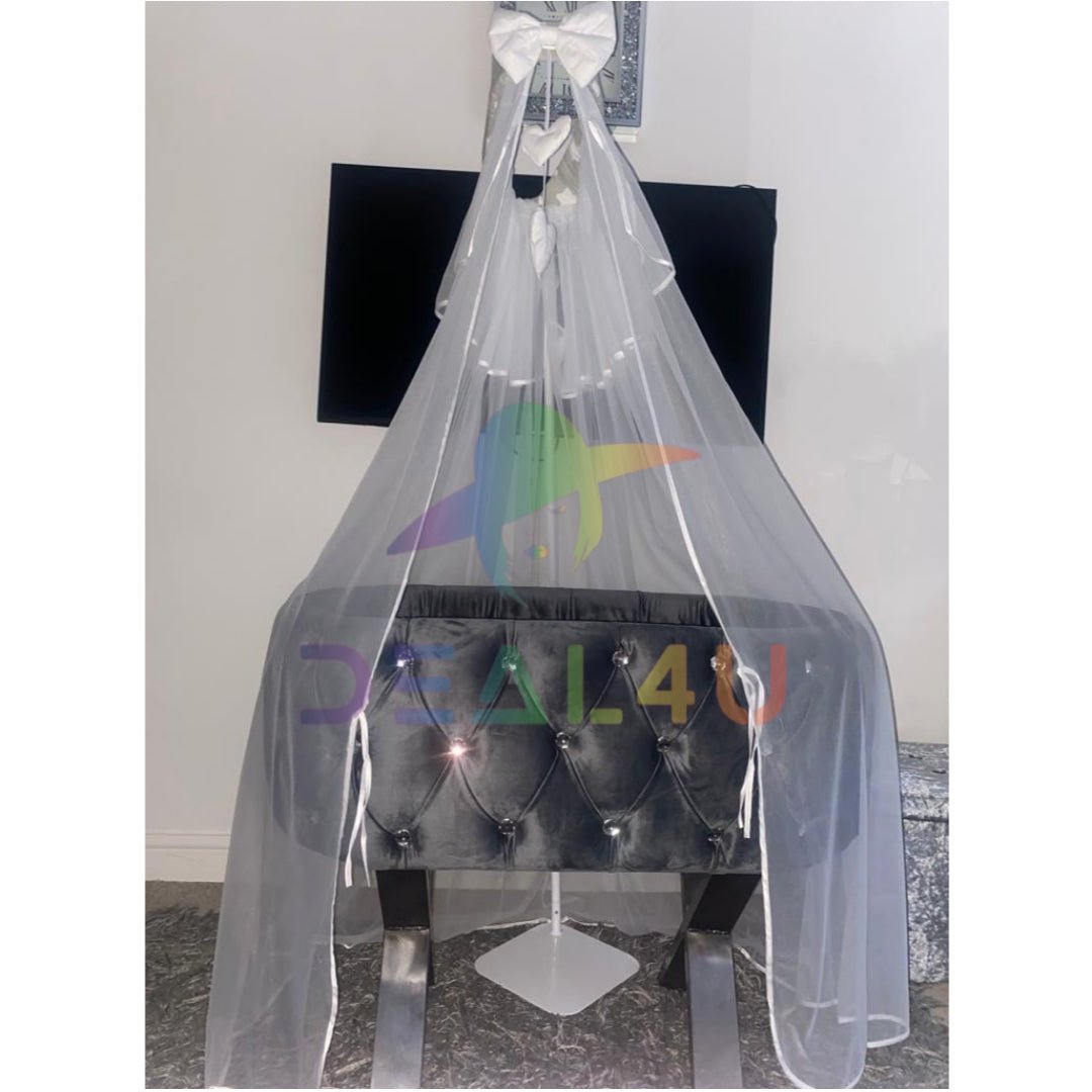 Handmade Baby Crib New born Sleeping Cot Bassinets, available in a choice of different colours. Stands are available in four different styles ‘X Shape stand’, the ‘Square Shape stand’,  'A Shape stand' and 'The Gold swing Stand'. Only the swing stand is in gold rest are finished in Black Colour but you can paint them yourself in any colour if you want. All bassinets are custom made here in the UK.