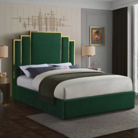Take your bedroom space to a whole new modern level with this Vector King Bed available in any colour. Posh fabric upholstered in a lovely colour is intersected by polished gold stripes in a geometric design that is nothing short of spectacular. This stunning bed has a gold stripes to finish off the presentation on a glamorous and upscale note. Different bases available with the bed to help provide support for your mattress. Gold stipes Headboard with extra edging on headboard, plain side rail and footboard. Our bed has been crafted with quality and customers in view. It comes with integrated support systems for a comfortable and restful night's sleep. Its design and construction ensures durability and longevity.